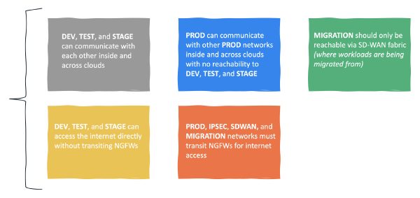 In Part 1, we laid out our foundation. In Part 2 and Part 3 we connected various networks (both cloud and on-premises) and provisioned NGFWs that scale to real-time capacity. By default, networks connected to our corporate segment have full-mesh connectivity to each other. Let’s build some policies in code that can work with the groups we created to produce logical micro-segmentation that mirror a few real-world use cases.